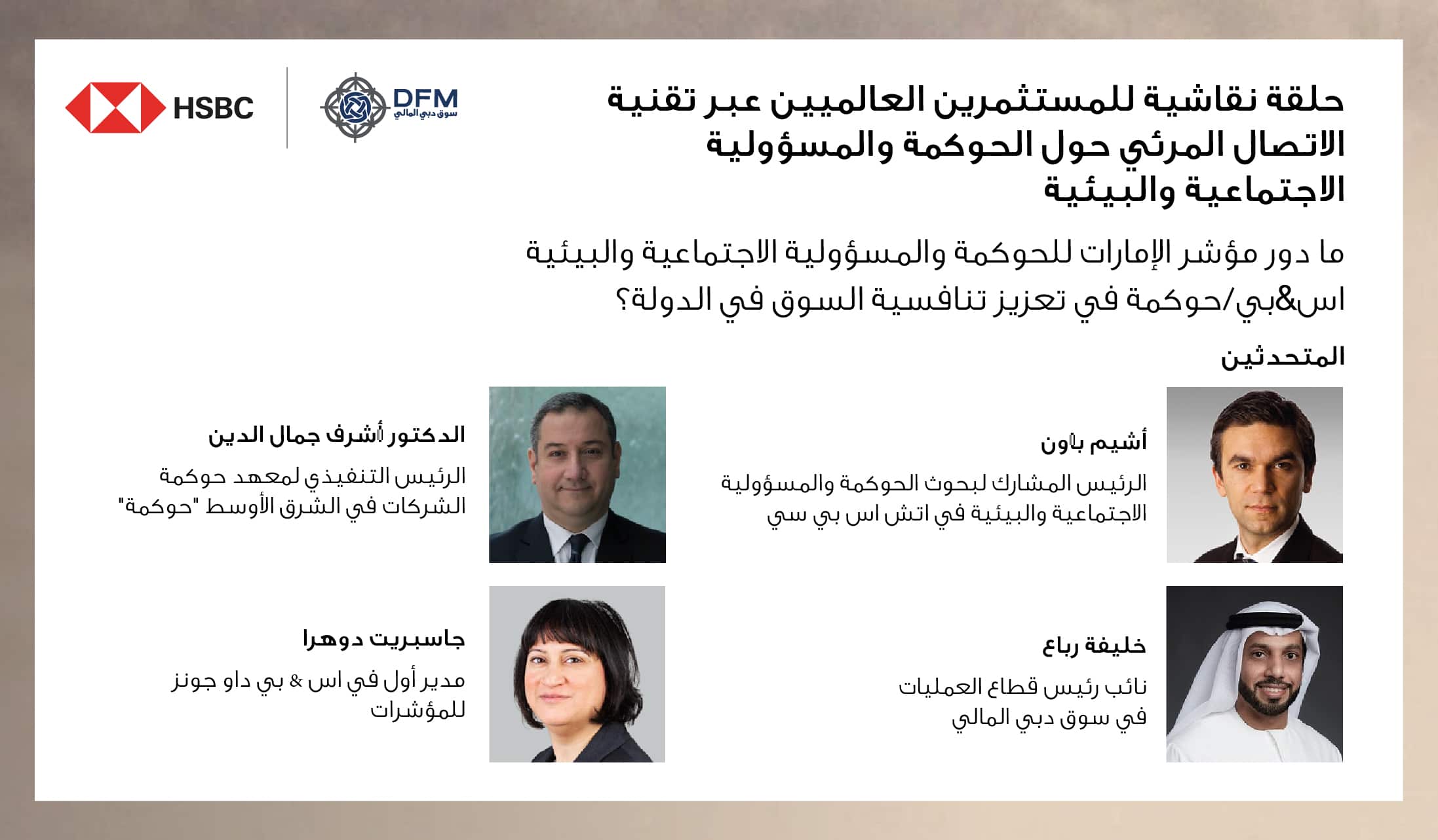وقال سعادة عيسى كاظم، رئيس مجلس إدارة سوق دبي المالي: “ينفذ سوق دبي المالي منذ العام 2016 سلسلة من المبادرات لنشر أفضل ممارسات الاستدامة في أوساط المتعاملين. ويسعدنا التعاون مع بنك اتش اس بي سي في تنظيم هذه الحلقة النقاشية حول ”مؤشر الحوكمة والمسؤولية الاجتماعية والبيئية في الشركات الإماراتية اس&بي/حوكمة – “ S&P/Hawkamah UAE ESG Index، وهو أحدث مبادرات السوق بهدف جذب المزيد من الاستثمارات من مجموعة أوسع نطاقاً وأكثر تنوعاً من المستثمرين العالميين الذين يبدون اهتماماً متزايداً بالحوكمة والمسؤولية الاجتماعية والبيئية عند اتخاذ قراراتهم الاستثمارية. ويوفر المؤشر مقياساً موثوقاً لمدى التزام الشركات المدرجة في الإمارات بتطبيق تلك المعايير. ومن جانب آخر فإنه يتيح للشركات المدرجة قياس أدائها في هذا المجال بما يساعدها على جذب الاستثمارات من المؤسسات الاستثمارية التي تنتهج الاستثمار المسؤول وتستند إلى مدى تطبيق الشركات المدرجة لمباديء الحوكمة والمسؤولية الاجتماعية والبيئية عند اتخاذ قراراتها الاستثمارية.”